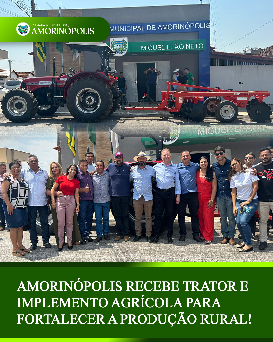 A Câmara Municipal de Amorinópolis registra com satisfação a chegada de um trator com implemento agrícola destinado a ampliar a capacidade produtiva do município. O equipamento representa investimento estratégico para o fortalecimento da agricultura familiar, melhoria da mecanização das lavouras e apoio direto à geração de renda no campo.