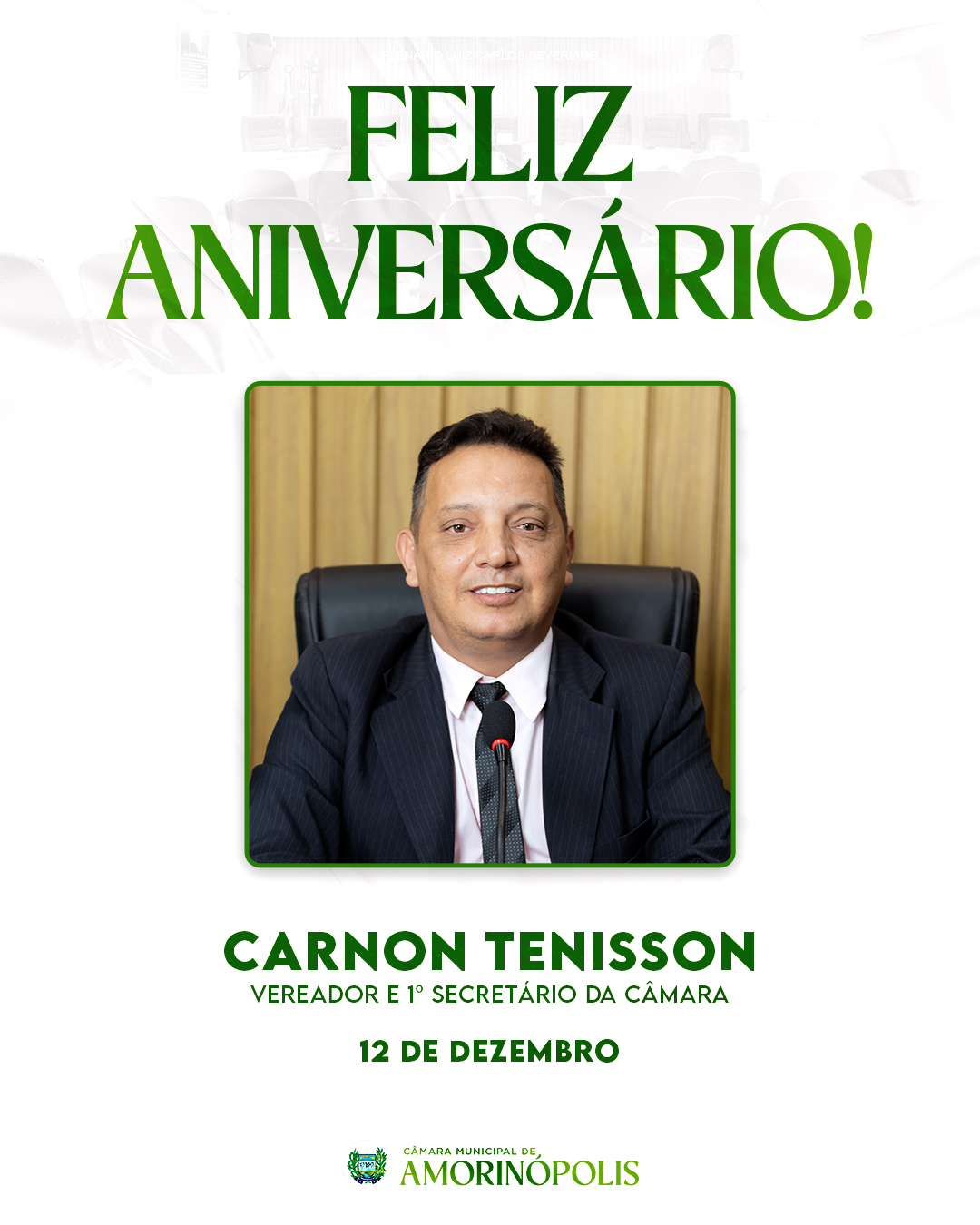 A Câmara Municipal de Amorinópolis celebra com alegria nesta sexta-feira, 12 de dezembro, o aniversário do nosso 1º Secretário, vereador Carnon Tenisson.