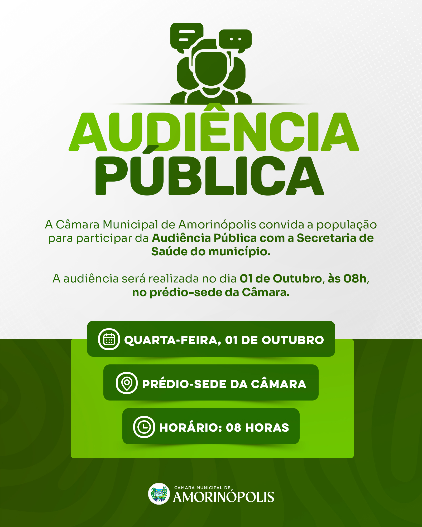 A Câmara Municipal de Amorinópolis convida toda a comunidade para participar da Audiência Pública com a presença da Secretaria Municipal de Saúde. O encontro será realizado no prédio-sede da Câmara, no dia 1º de outubro, com início às 08h.