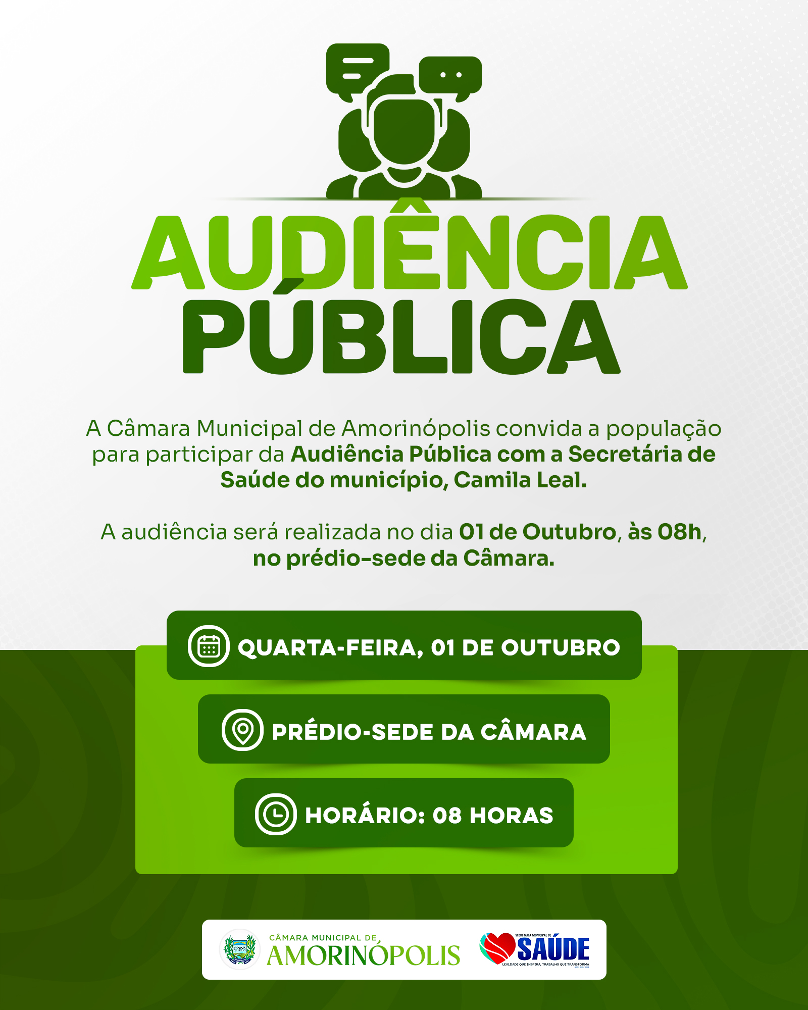A Câmara Municipal de Amorinópolis convida toda a comunidade para participar da Audiência Pública com a presença da Secretária Municipal de Saúde, Camila Leal. O encontro será realizado no prédio-sede da Câmara, no dia 1º de outubro, com início às 08h.