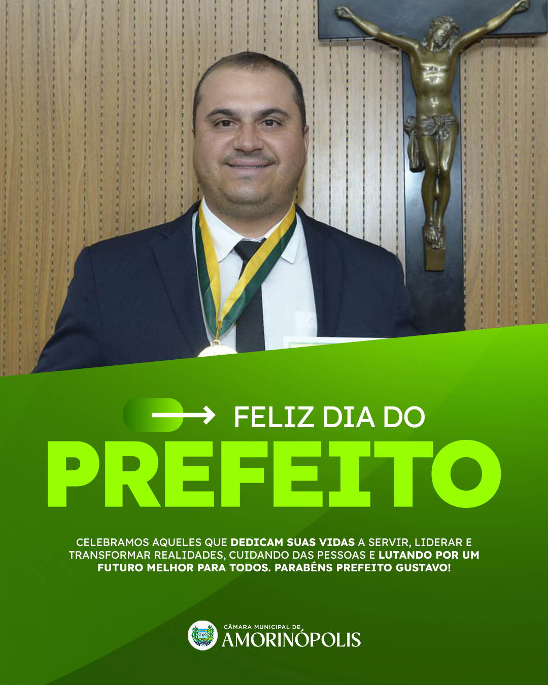 A Câmara Municipal de Amorinópolis tem a honra de homenagear o Prefeito Gustavo Silva de Oliveira (Gustavo do Estrelão). Reconhecemos o seu trabalho incansável e a sua dedicação empenhada para realizar um mandato que atenda às necessidades de todos os munícipes, enfrentando os desafios com sabedoria e compromisso. Feliz Dia do Prefeito!