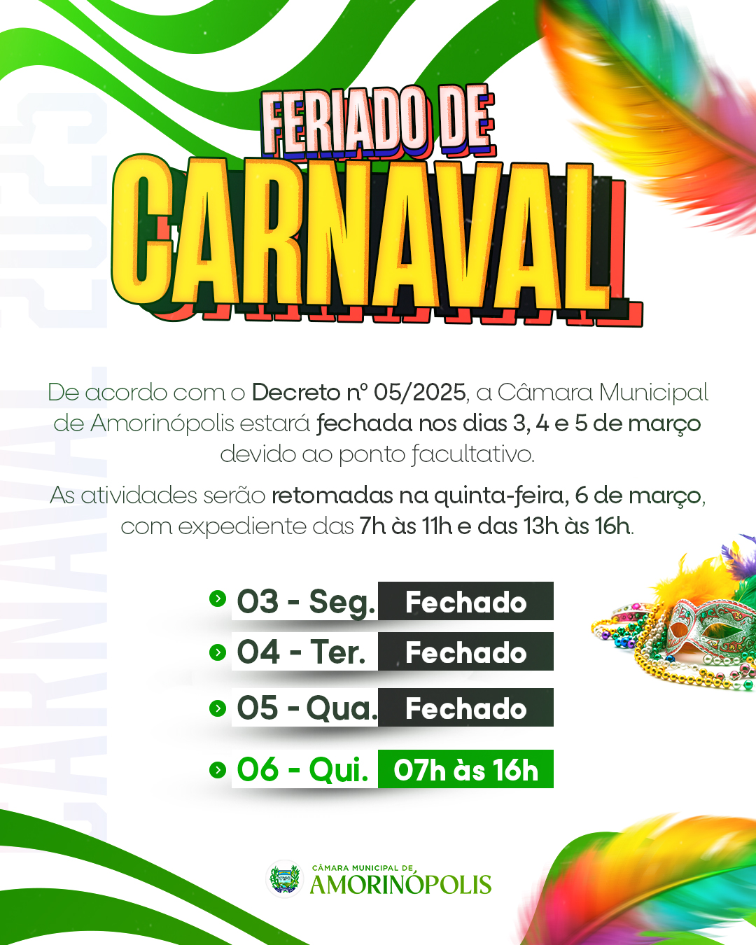 De acordo com o Decreto nº 05/2025, a Câmara Municipal de Amorinópolis estará fechada nos dias 3, 4 e 5 de março devido ao ponto facultativo.