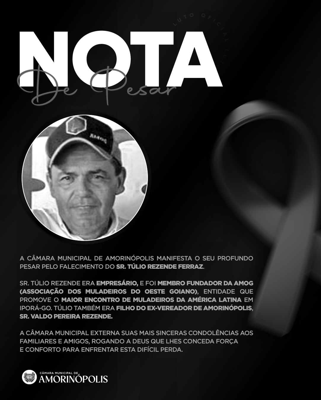 A Câmara Municipal de Amorinópolis manifesta o seu profundo pesar pelo falecimento do Sr. Túlio Rezende Ferraz.
